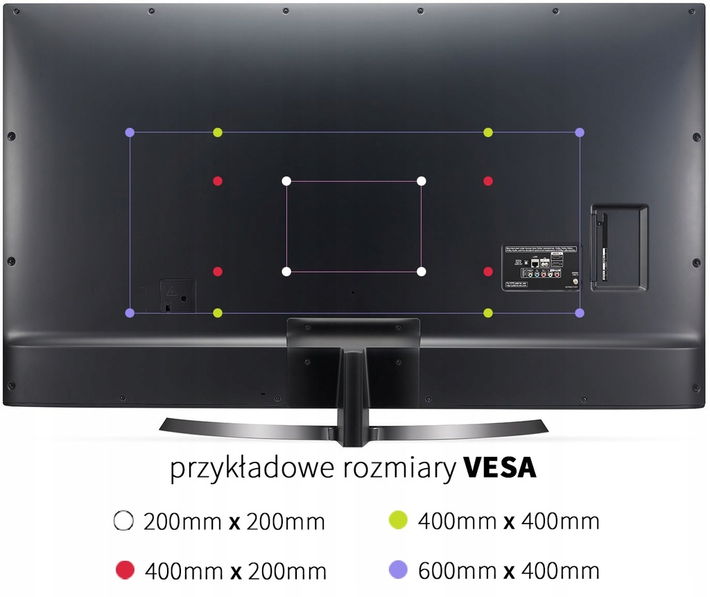 - Стандарт VESA (Ассоциация по стандартизации видеоэлектроники) — это стандарт монтажа, информирующий о расстоянии между отверстиями, точки крепления должны иметь вешалку, на которую мы хотим повесить телевизор. Тип отверстий проверить очень легко: это описано в инструкции. Если эта информация отсутствует, вы можете самостоятельно измерить расстояние между крепежными отверстиями, расположенными на задней панели телевизора. Наиболее распространенными являются: VESA 200 x 200, VESA 100 x 100, VESA 300 x 300, VESA 400 x 400, VESA 600 x 400, где первое число определяет расстояние между левым и правым отверстиями в одном ряду (по горизонтали), а второе число - между нижним и верхним (горизонтально).