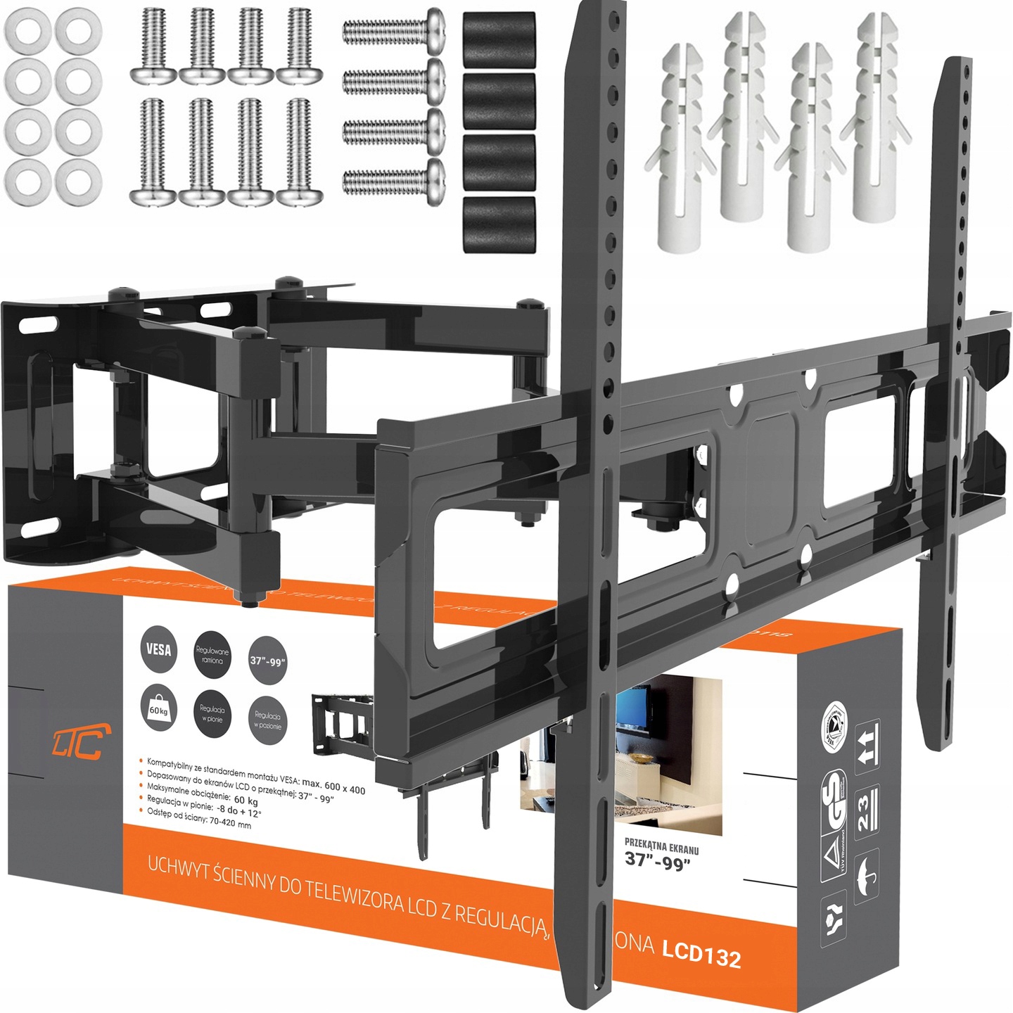 Настенное крепление бренда LTC — это надежное и универсальное решение, предназначенное для широкого спектра моделей телевизоров. Конструкция держателя позволяет устанавливать телевизоры с диагональю экрана от 37 до 99 дюймов, но благодаря высоким параметрам прочности возможен монтаж и более крупных моделей