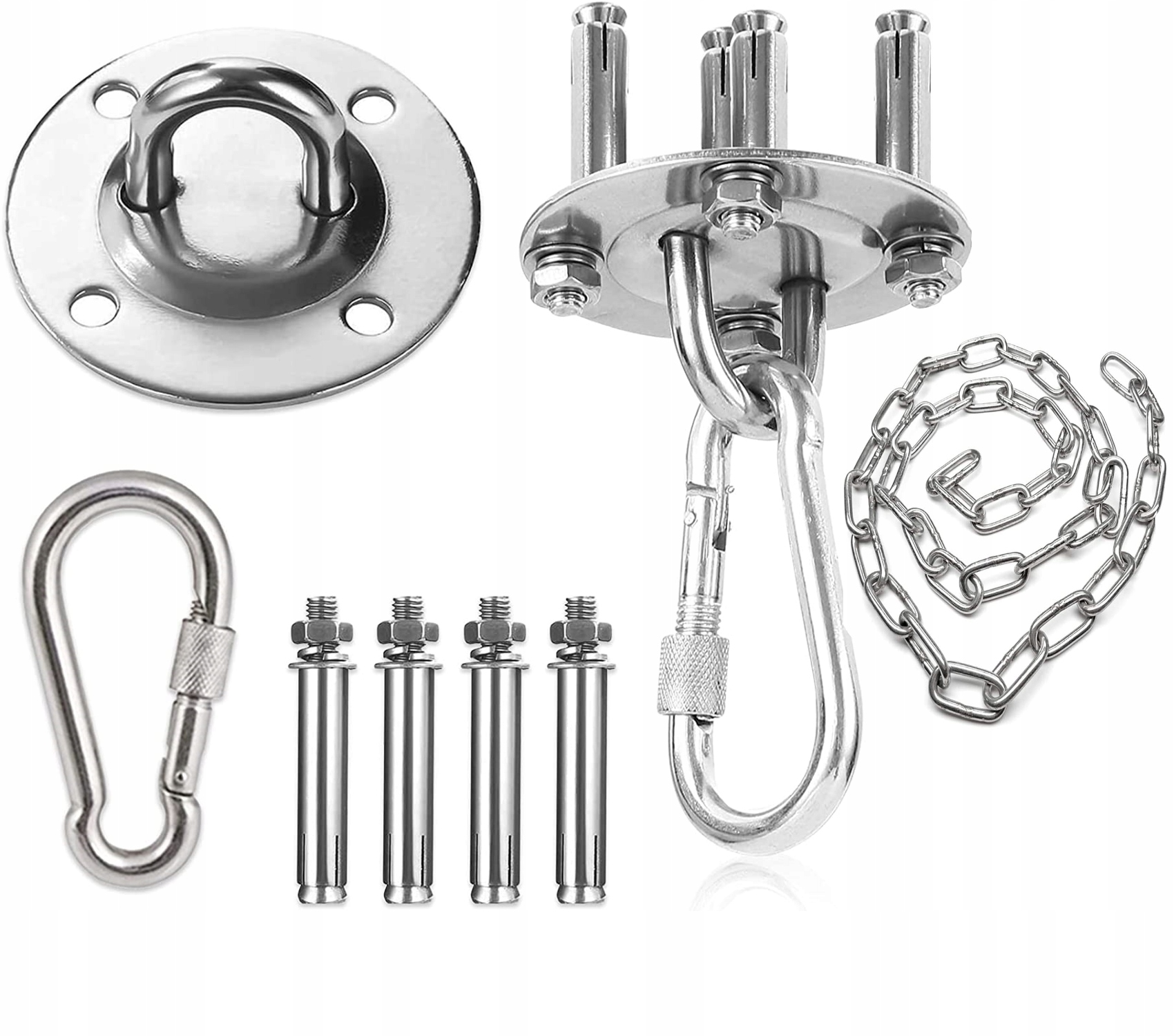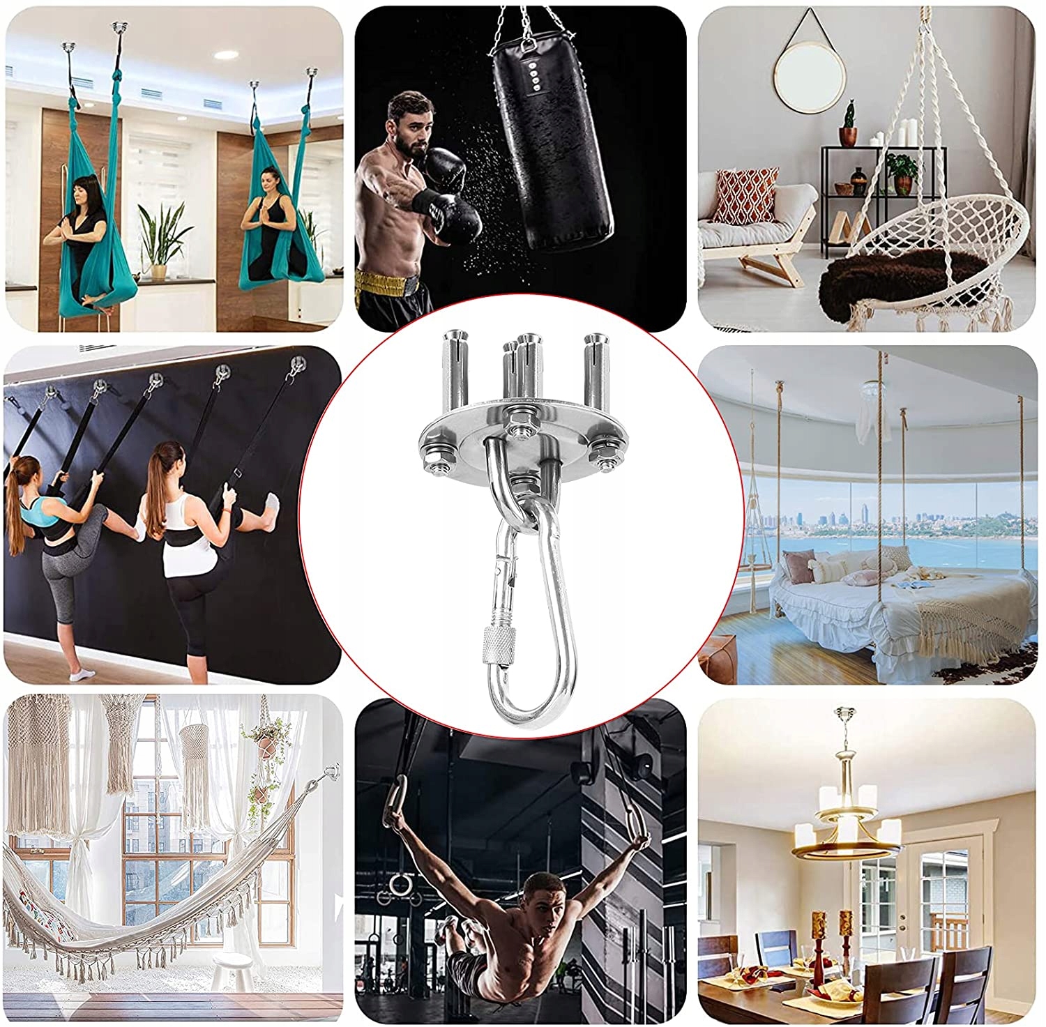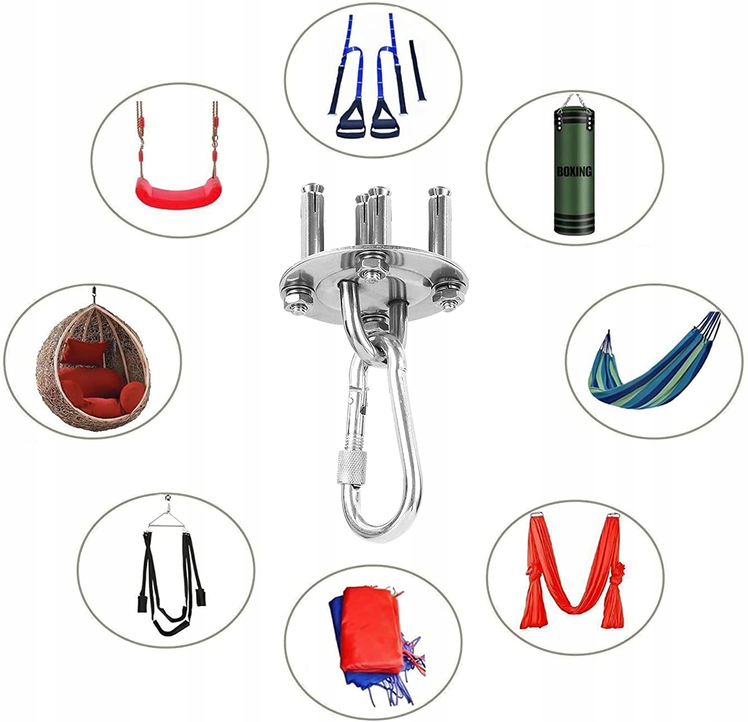 Идеальный набор для крепления к потолку множества различных изделий, например, качелей «аистовое гнездо», бразильского кресла, боксерской груши, лент для акробатических упражнений
