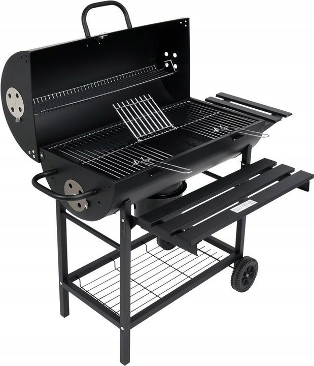 Barrel — это большой и компактный угольный гриль, на котором можно легко разместить даже 10 человек. человек одновременно. Два колеса и ручка помогут легко переместить гриль из одного места в другое. Преимуществом Grill Chef Barell являются две складные полки спереди и сбоку гриля, на которых можно, например, убрать блюда с мясом или овощами. Когда вы не готовите на гриле, вы можете легко сложить полки, сэкономив ценное место для хранения. На решетчатую полку под мангалом можно разместить пакет с брикетами или углем.