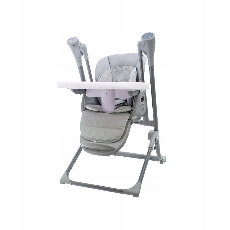 Стульчик для кормления с функцией качания. Кресло имеет 6 доступных вариантов высоты и четыре положения регулировки спинки. Функция поворота доступна в самом нижнем положении. Лоток для кормления можно установить в трех положениях. Столешница состоит из двух частей и может быть приспособлена для еды или игры. Регулируемая подножка. Изделие имеет панель управления с: пятью диодами, показывающими текущую скорость качания, таймером с тремя временными интервалами и кнопкой воспроизведения музыки.