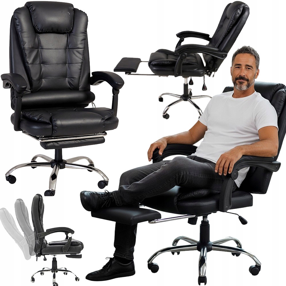 Поворотное эргономичное офисное кресло с массажем, подставкой для ног и регулировкой, черная ПУ экокожа + подставка для ног, регулировка угла, хромированное основание.