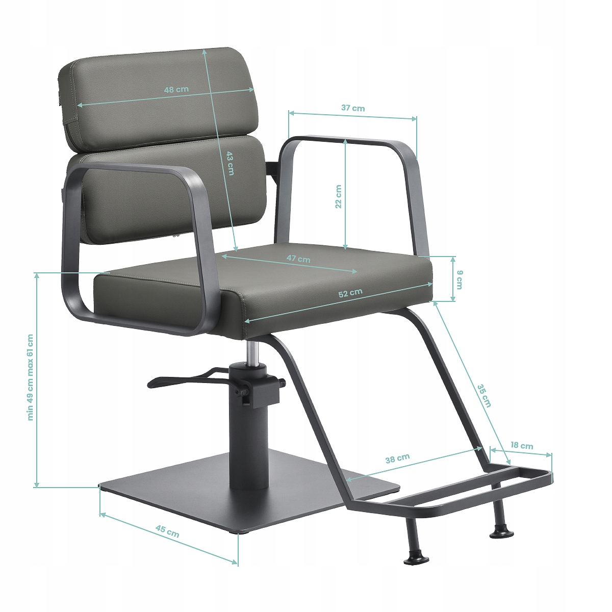 Механизм полного поворота, которым оснащено кресло, делает работу парикмахера более эффективной и комфортной. Прочное плоское квадратное основание гарантирует устойчивость во время использования. Матовая, гладкая поверхность придает элементу элегантный вид и позволяет легко содержать его в чистоте. Удобное сиденье с пенопластовым наполнением обеспечивает высокий комфорт использования даже во время многочасовых процедур. Металлические подлокотники геометрической формы позволяют плечам клиента располагаться правильно - это означает, что клиент не зарывается головой в плечи и не сутулится, - что явно облегчает выполнение точных процедур, включая стрижку. Стильная подставка для ног, предназначенная для этой модели, обеспечивает устойчивую поддержку ног пользователя.
