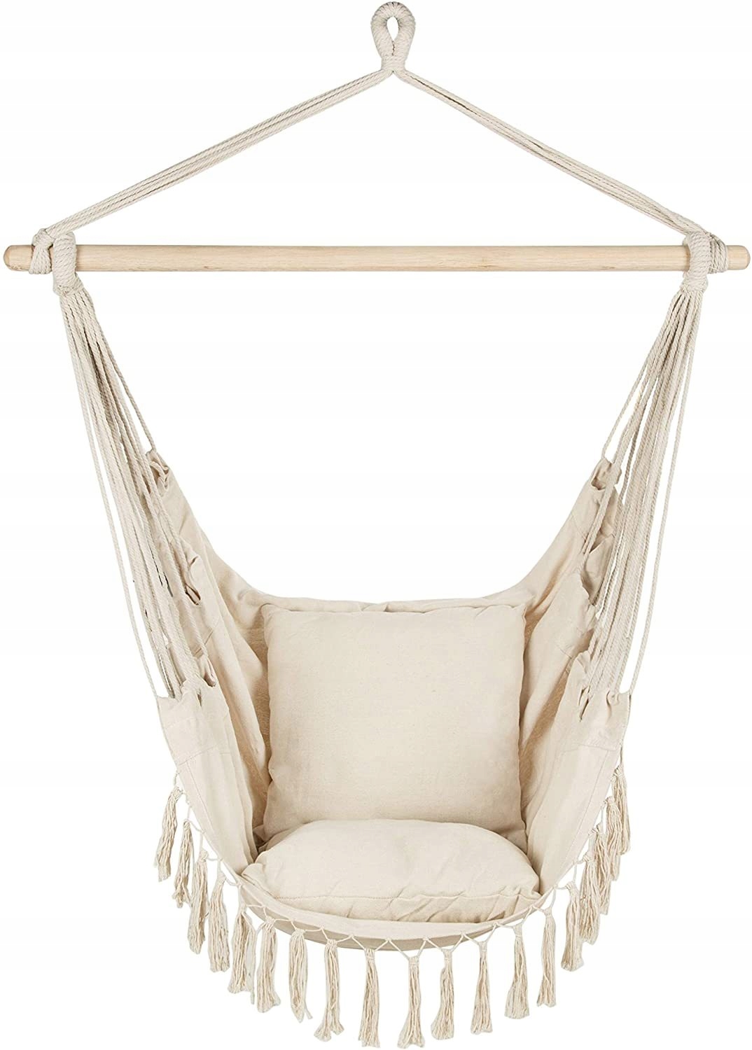 Современный дизайн позволяет идеально вписаться в любой дизайн интерьера. Качели имеют прочную оснастку из 100% хлопка и прочную конструкцию на основе деревянного шеста. Максимальная нагрузка на сиденье – 100 кг. Кресло имеет множество применений, что делает времяпрепровождение более приятным как для пожилых, так и для молодых людей.