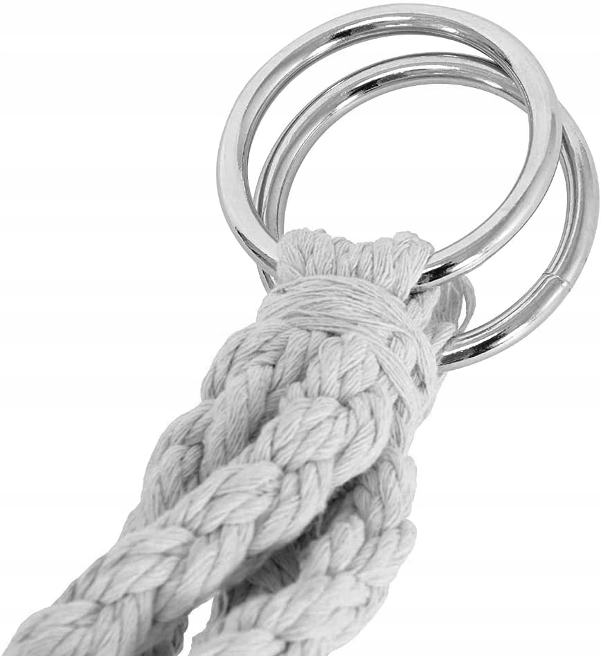 В Того толстые и прочные хлопковые шнуры. Металлические кольца гарантируют безопасность во время использования и позволяют закрепить подвесное кресло двумя способами.