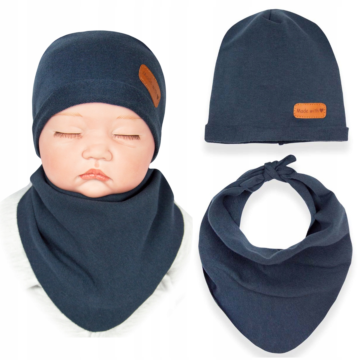 Набор полностью сделан из гибкой толстовки, благодаря которой он хорошо. Мы выбрали высококачественную трикотаж - толстый и приятный на ощупь. благодаря его эластичности, шляпа аккуратно придерживается головы ребенка, а носовой платок легко связывается на шее.