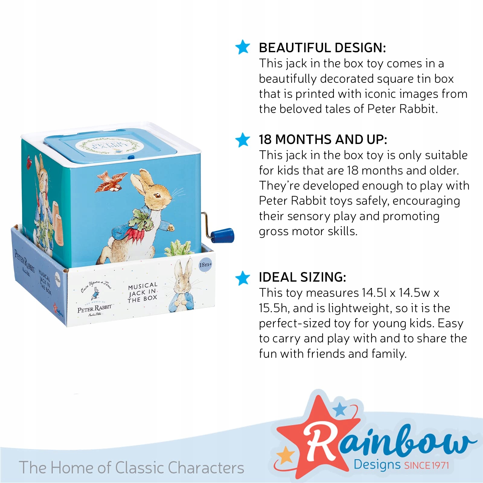 Этот красивый Джек Кролик Питер в коробке из классических книг о Беатрикс Поттер включает в себя классические иллюстрации из оригинальных книг о Беатрикс Поттер и красивый мягкий всплывающий Питер! просто поверните ручку, и из Питера выскочит красивая музыкальная мелодия. Домкрат «Кролик Питер» в коробке подходит с рождения. Минимальный возраст: 18 месяцев. Рекомендуемый возраст: 18 месяцев + рост: 154 см. Ширина: 14,5 см. Длина: 14,5 см. Соответствует EN71.