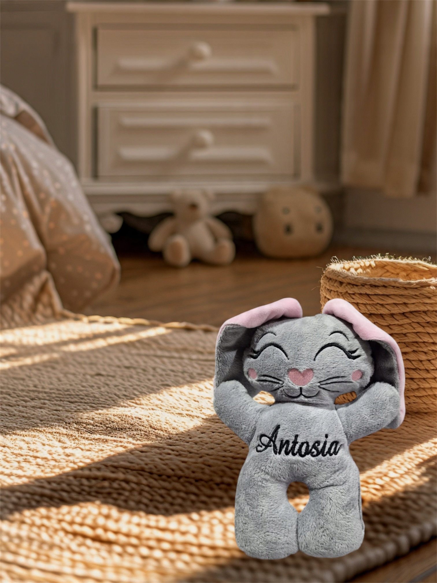 На зайчике вышито имя ребенка, что придает ему неповторимый характер и делает его единственным в своем роде. Персонализация делает его незабываемым подарком — это подарок, который останется с ребенком на долгие годы как ценный сувенир из детства. Такой именный кролик станет идеальным выбором для крещения, рождения, дня рождения или любого другого торжественного случая.