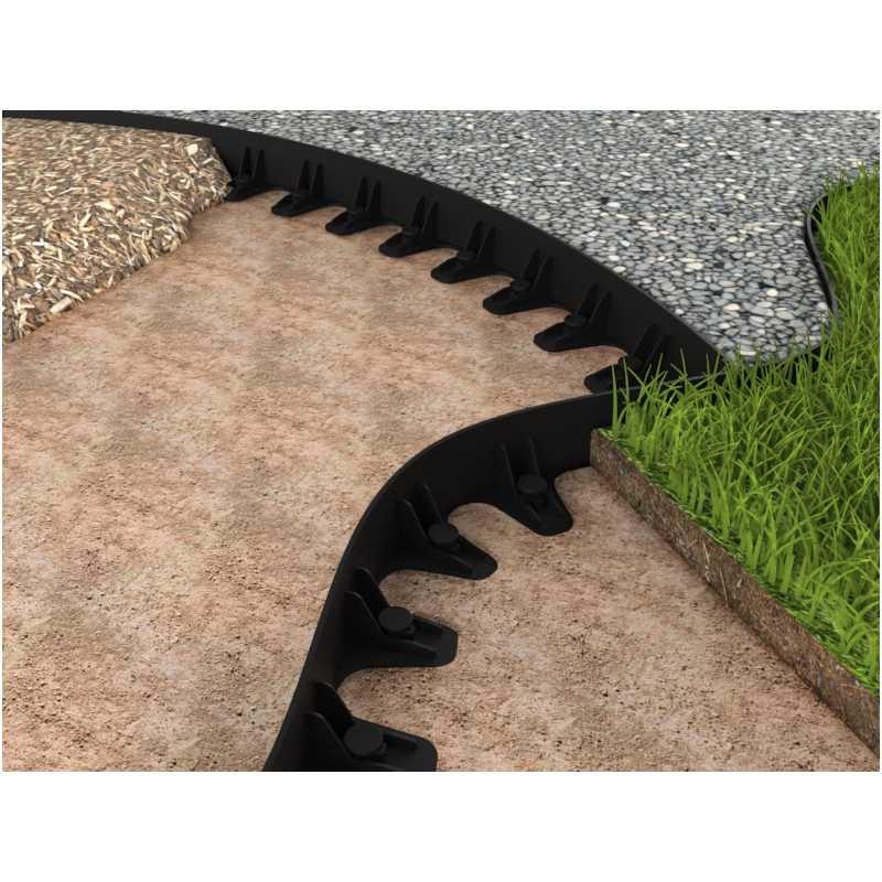 Благодаря своей гибкости кромка позволяет свободно формировать края поверхностей из брусчатки или гальки. Он прост в установке и не требует резки или глубоких раскопок. Метровые элементы легко соединяются друг с другом. Их можно сгибать внутрь и наружу, что позволяет формировать из них самые изысканные дорожки и дорожки. Полезная длина одной кромки – 1 метр.