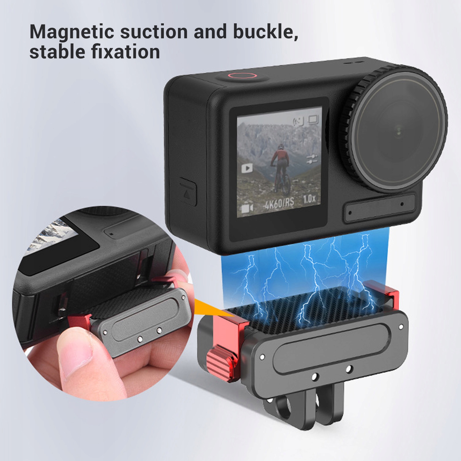 2. Механизм быстрого освобождения: этот механизм быстрого освобождения, специально разработанный для камеры Action 3/4, обеспечивает стабильное и надежное удержание, удерживая камеру на месте при съемке быстро движущихся объектов