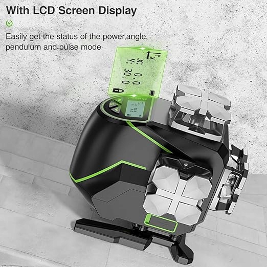 Лазерный уровень Huepar S04CG оснащен ЖК-экраном, на котором можно легко отображать состояние батареи, угол, челночный и импульсный режим.