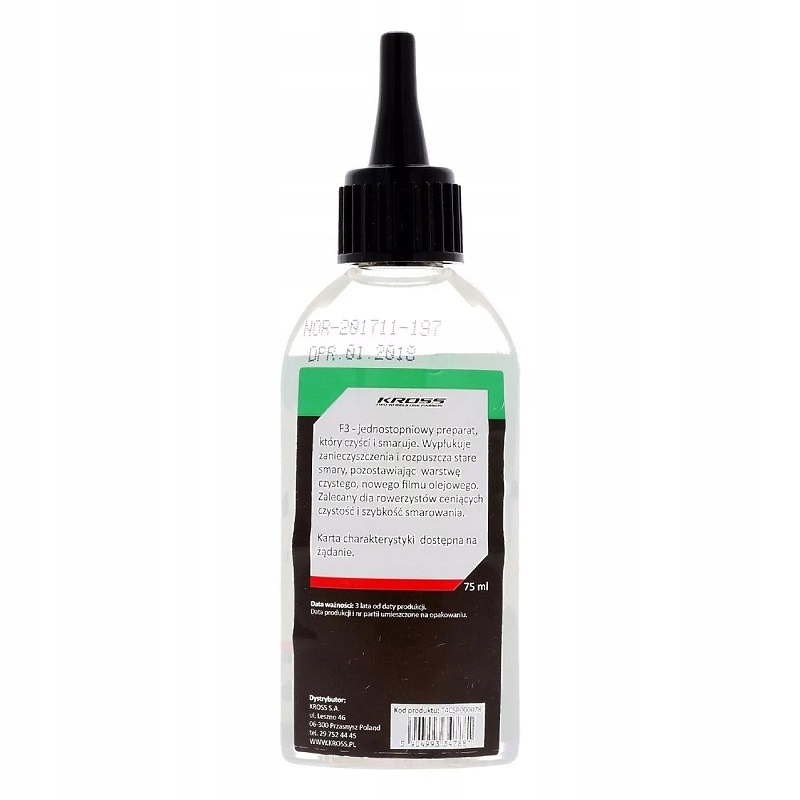 Масло для велосипедных цепей F3 от Kross – идеальное решение для велосипедистов, которые ищут fast, а также одноэтапное средство по уходу за системой привода. Средство быстро растворяет старую смазку и смывает загрязнения. В результате образуется слой чистой новой пленки, характеризующейся низким коэффициентом трения скольжения. Поверхность становится устойчивой к прилипанию частиц грязи и пыли.