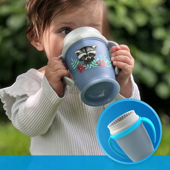Легко мыть, позволяет пить, не проливая, но намеренно не является непроливаемым (капли жидкости выпадают при сильном встряхивании или падении). Оно учит ребенка контролировать движения и готовит его пить из открытой чашки.