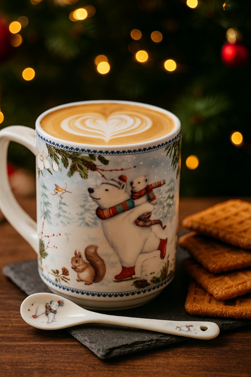 ❄️ ФАРФОРОВАЯ КРУЖКА С ЛОЖКОЙ И ПОДАРОЧНОЙ КОРОБКОЙ – ЗИМНИЙ ПОЛЯРНЫЙ МЕДВЕДЬ