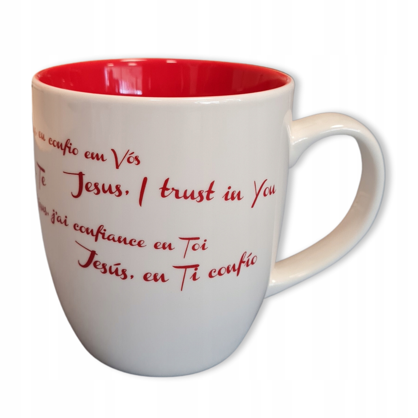 Красная кружка Misericordia с надписью «Иисус, я верю в Тебя» на разных языках.