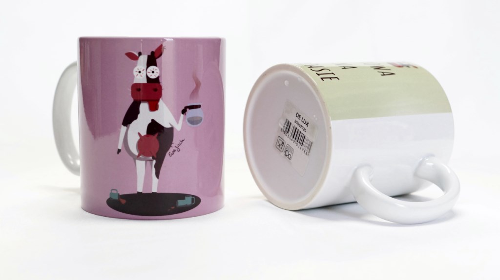 Керамическая кружка с красочным принтом, не обязательно имеющая верхнее и нижнее поле.