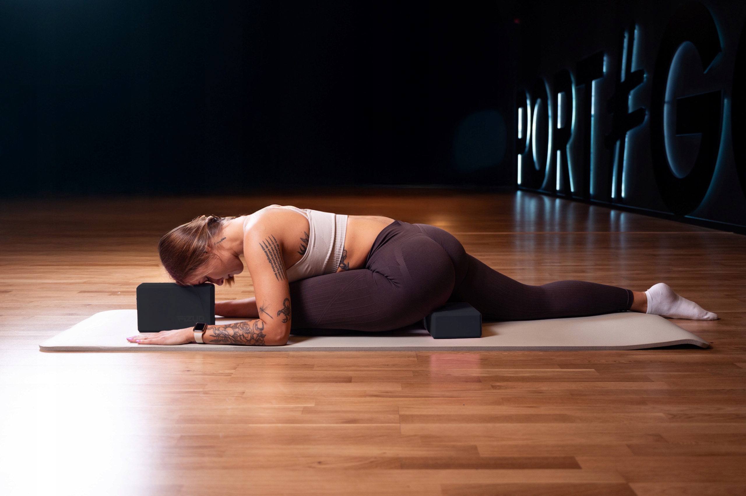 - Развитие гибкости и подвижности — с помощью двух кубиков можно постепенно углубить диапазон движений в позах растяжки, что приводит к лучшим результатам.