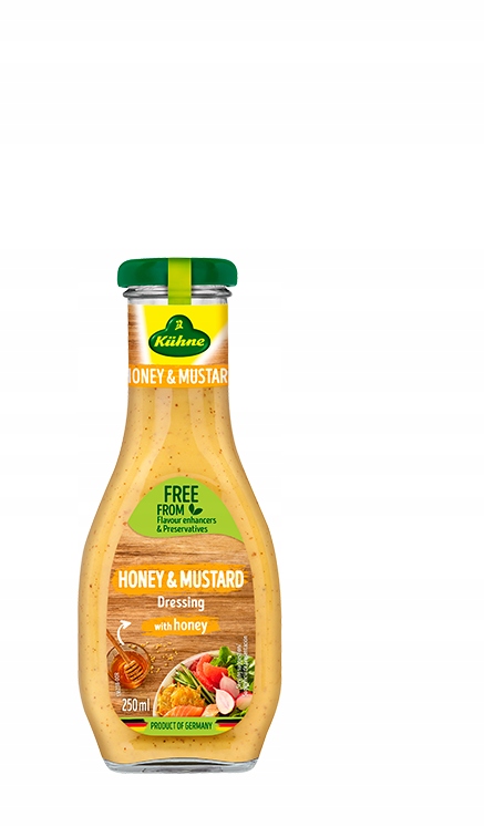 KUHNE Заправка Медово-Мустрад 250мл. Медово-горчичная заправка Kuhne – идеальный соус к блюдам на гриле, он также подходит к салатам, мясным и овощным блюдам. Медово-горчичная заправка Kuhne благодаря добавлению цветочного меда придает блюдам слегка сладковатый вкус, а горчица придает легкую горчинку, что придает соусу неповторимый вкус.