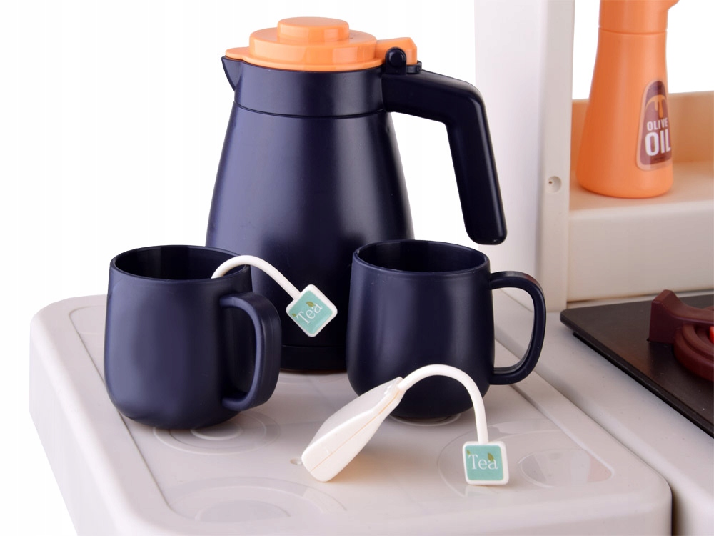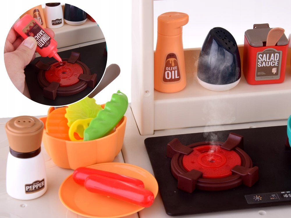 Горелки также имеют звуковые эффекты. После поворота ручки влево конфорки загорятся красным светом, вы услышите характерный звук приготовления пищи, а после заполнения бака (ок. 40 мл воды) из конфорки поднимется дым (водяной пар). Дополнительная привлекательность – вода течет из крана (работает по замкнутому контуру).