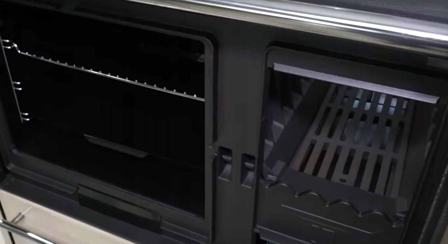 Особое внимание здесь следует уделить очень прочным, чугунным элементам, которые вступают в прямой контакт с огнем, например в качестве нагревательных плит и дверок печи . Кроме того, производитель позаботился о деталях отделки кухни, таких как эмалированный внешний кожух с воздушным охлаждением, эмалированная духовка с жаровней и решеткой, а также направляющие, позволяющие установить ее на 3 уровня.