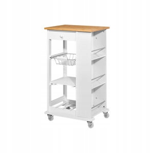 Мобильная кухонная мебель с универсальным пространством сплошной рабочей столик из бамбукового дерева с выдвижной металлической корзиной; Поверхность хранения и винная стойка для интегрированной боковой полки с вместительными отсеками 4 Легко перемещать колесо, включая 2 монтажных материала, заблокированные в наборе и инструкции макс. Нагрузка емкость: Рабочая поверхность: 10 кг полки/металлическая корзина: 3 кг Ящик: 2 кг. Украшение не включено в материал MDF; Бамбук, пластик, размерность сосны. 50 x 86,5 x 38,5 см (ширина x высота x глубина) Вес ок. 11,5 килограмма.