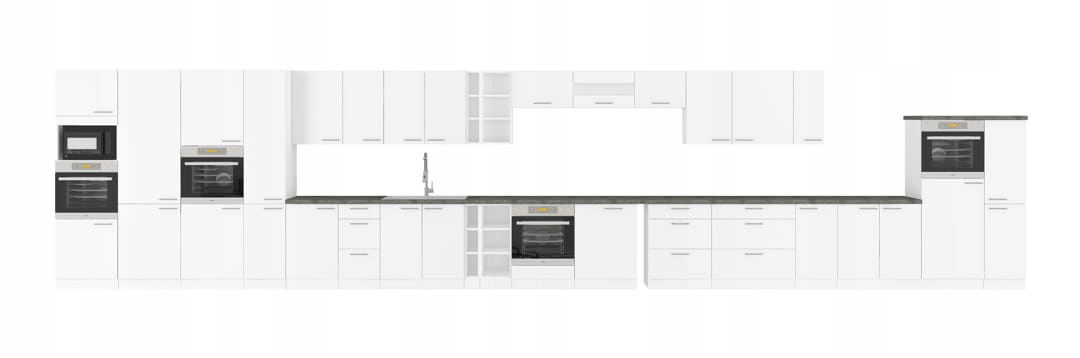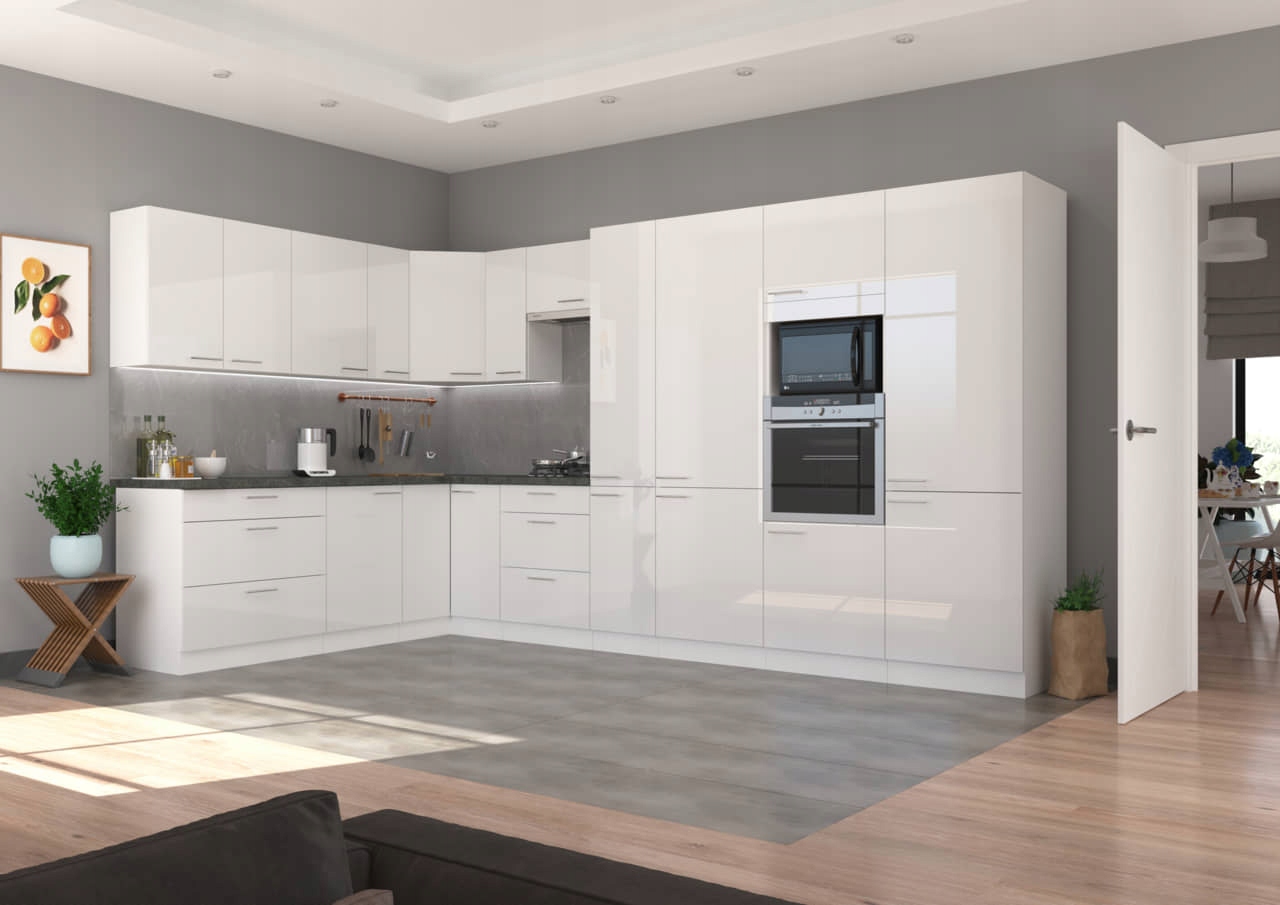 Комплект кухонной мебели Лара белый глянец строительной длиной 230 на 370 см, включая 14 шкафов.