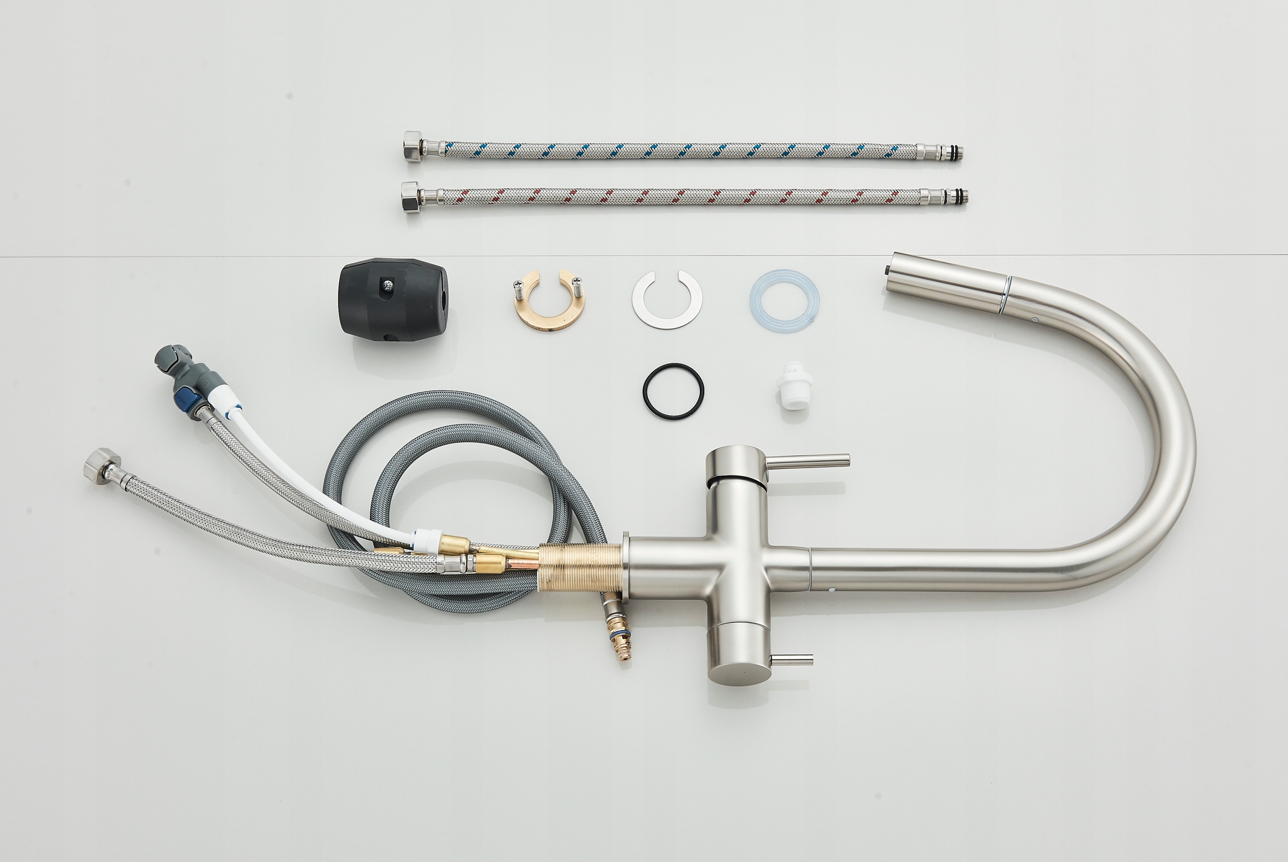 - Средний жемчуг: Да кухонная батарея, монтажные элементы, уплотнения, шланги подключения, веса