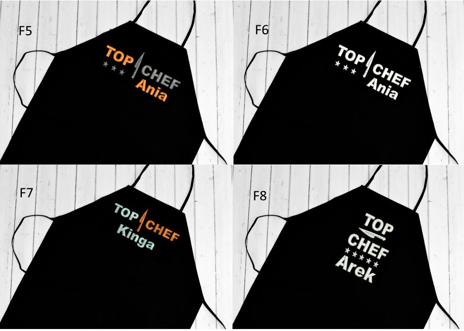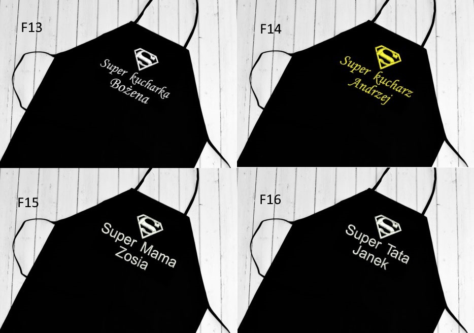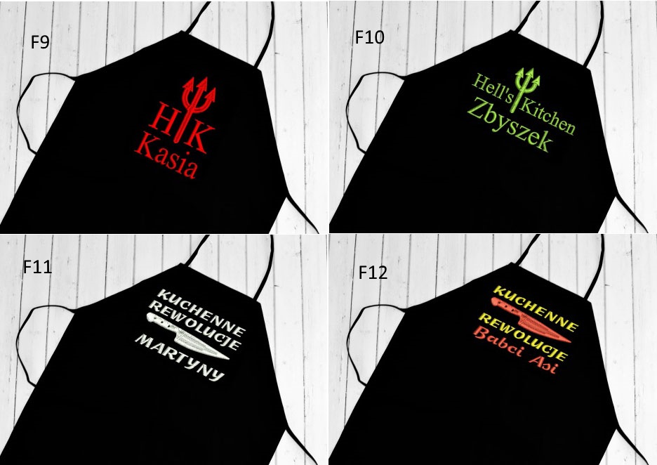 На фартуке мы можем вытешить один из представленных дизайнов или наш собственный логотип. Имена в представленных примерах, очевидно, мы можем вытешить любую надпись. Цвета потока также можно изменить. Фартук как для женщин, так и для мужчин (унисекс). В нижней части аукциона точные размеры фартука