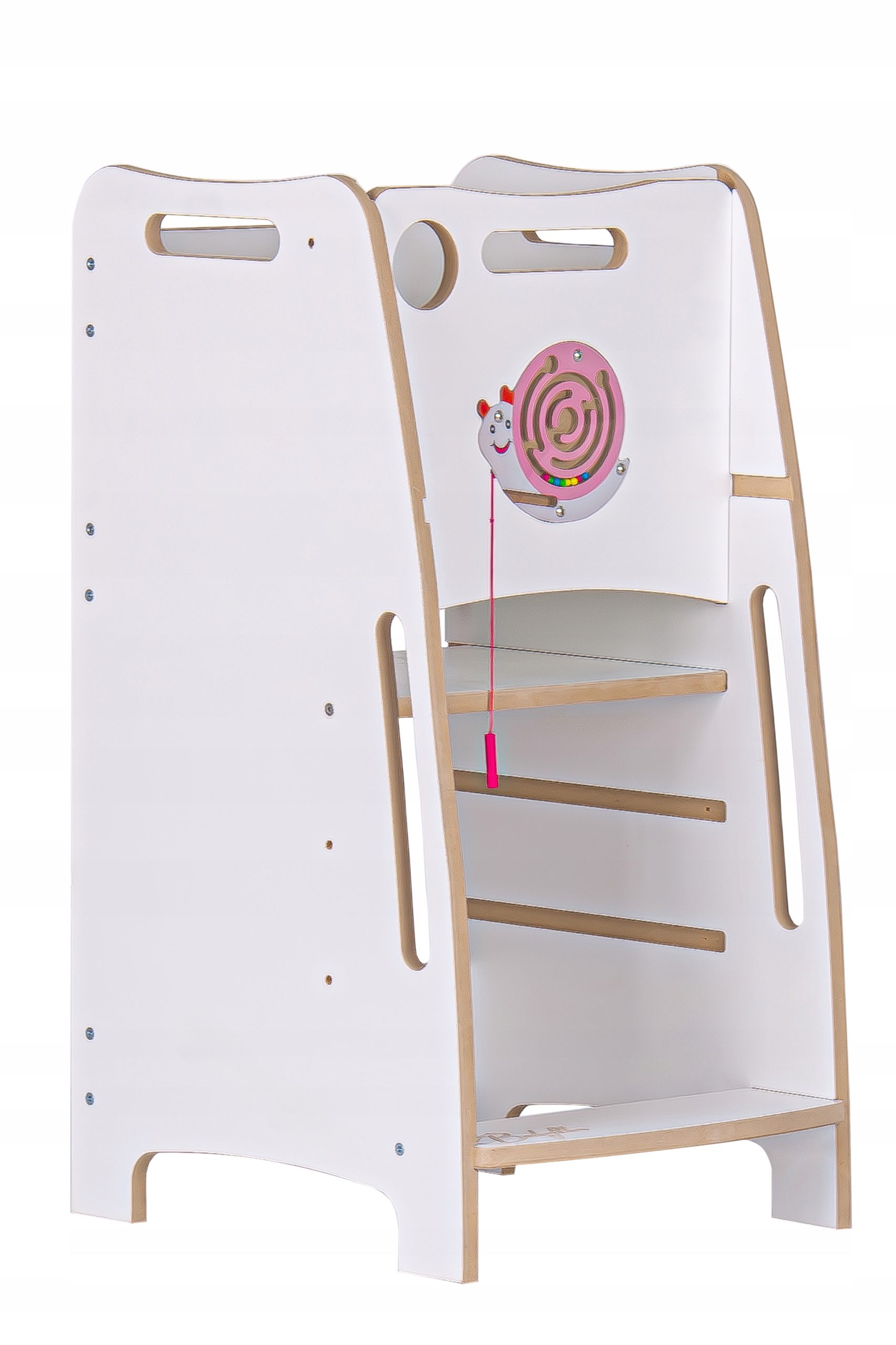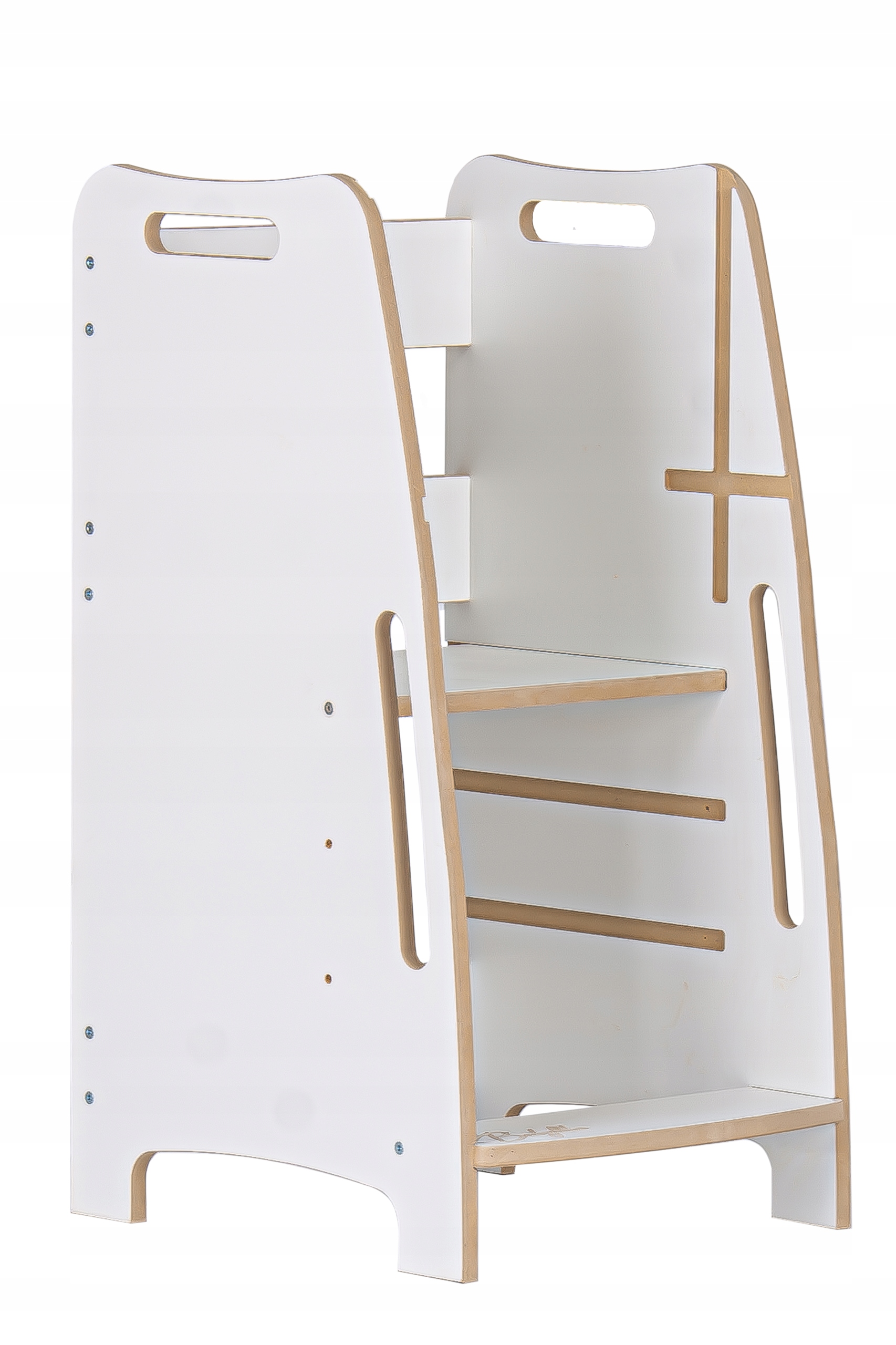 Белый ламинированный МДФ. Изделие отшлифовано вручную с максимальным вниманием к деталям и комфорту ребенка.
