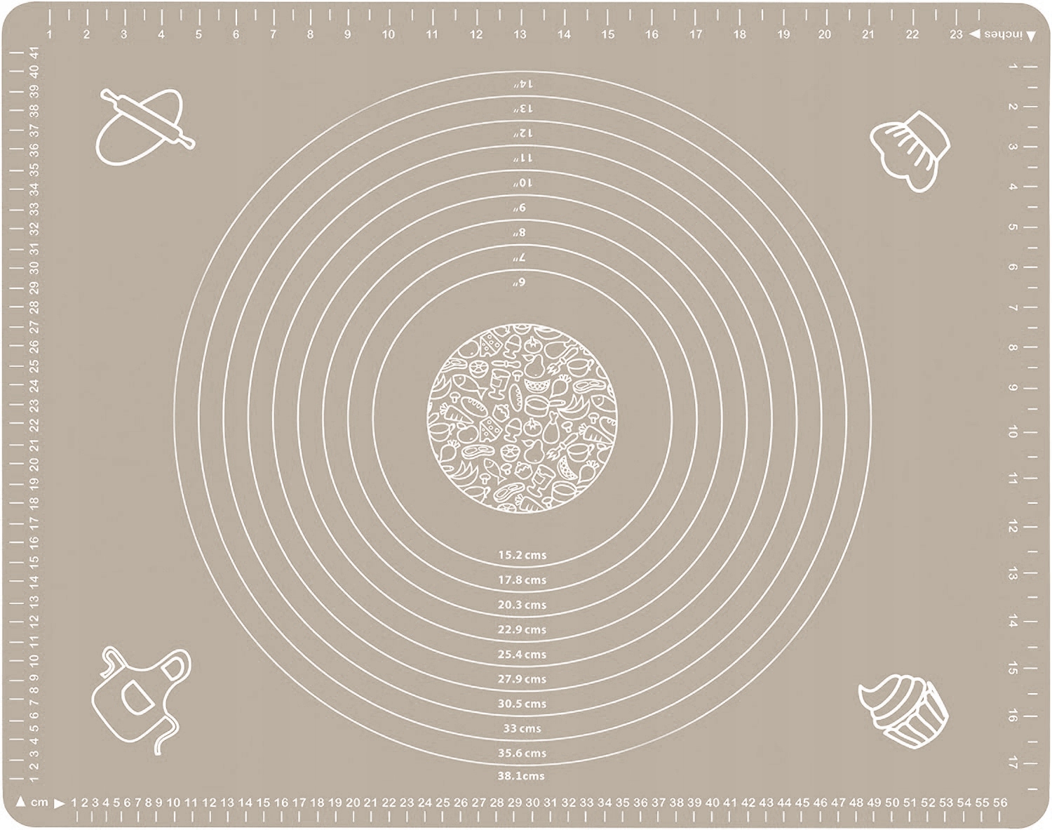 - имеет меры в сантиметрах и дюймах, шкалы (круги), полезные при приготовлении, например, тортов,