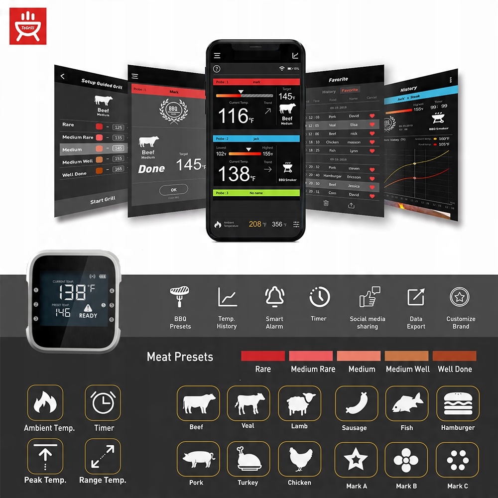 Получайте уведомления с помощью приложения ToGrill и точно проверяйте температуру с помощью графиков. Заданные Министерством сельского хозяйства США температуры мяса и различные степени прожарки легко использовать новичкам.