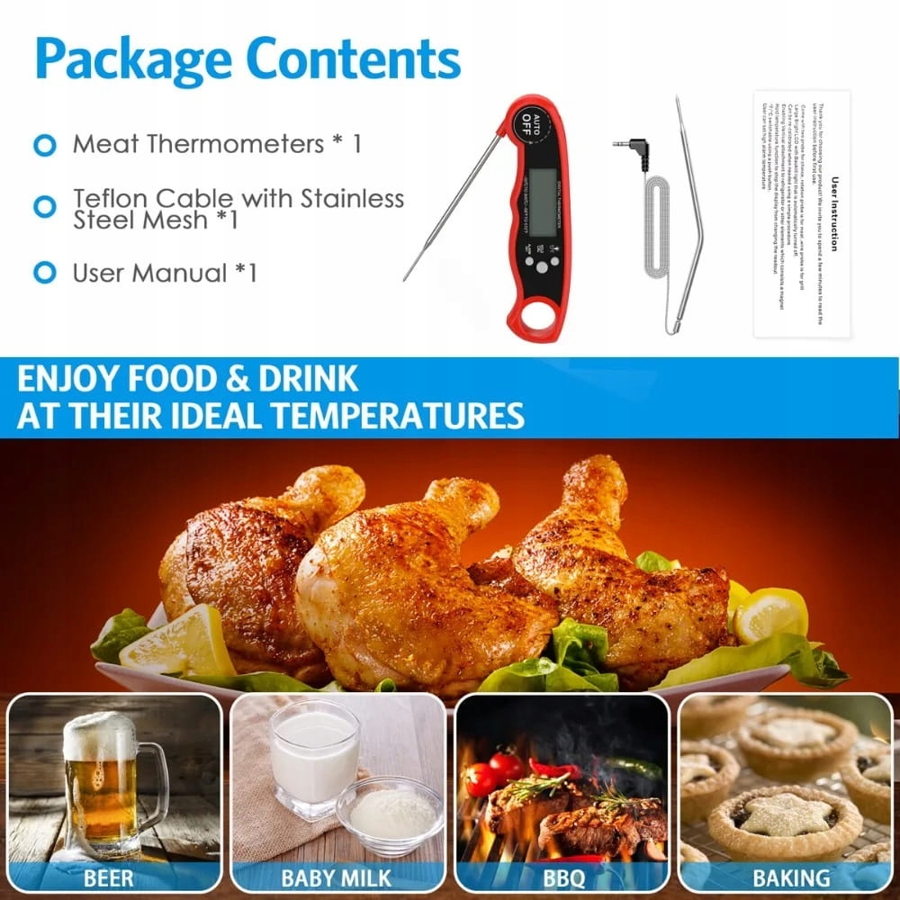Этот термометр для мяса оснащен длинным зондом из нержавеющей стали 304, который можно сложить на 180°. Он позволяет безопасно измерять температуру, а это означает, что вы можете использовать его для всех пищевых продуктов (например, рождественской индейки, тортов, курицы, баранины, рыбных стейков), не загрязняя их.