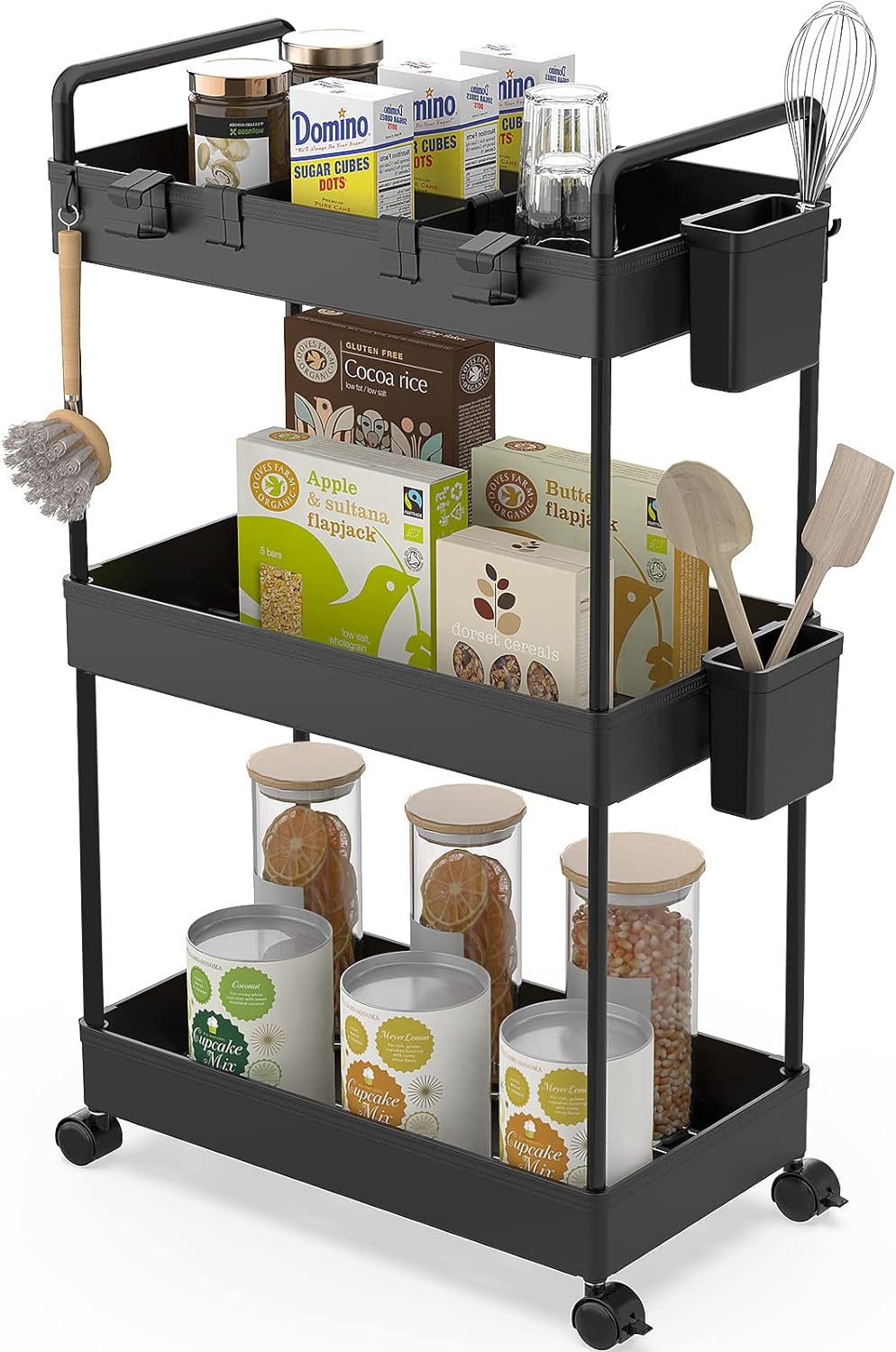 Узкая тележка для хранения Ronlap, трехъярусный органайзер для тележки для хранения на колесах, тележка для инструментов с ручкой, подвесные отделения для чашек, для офиса, ванной комнаты, кухни, прачечной, узких помещений, черный