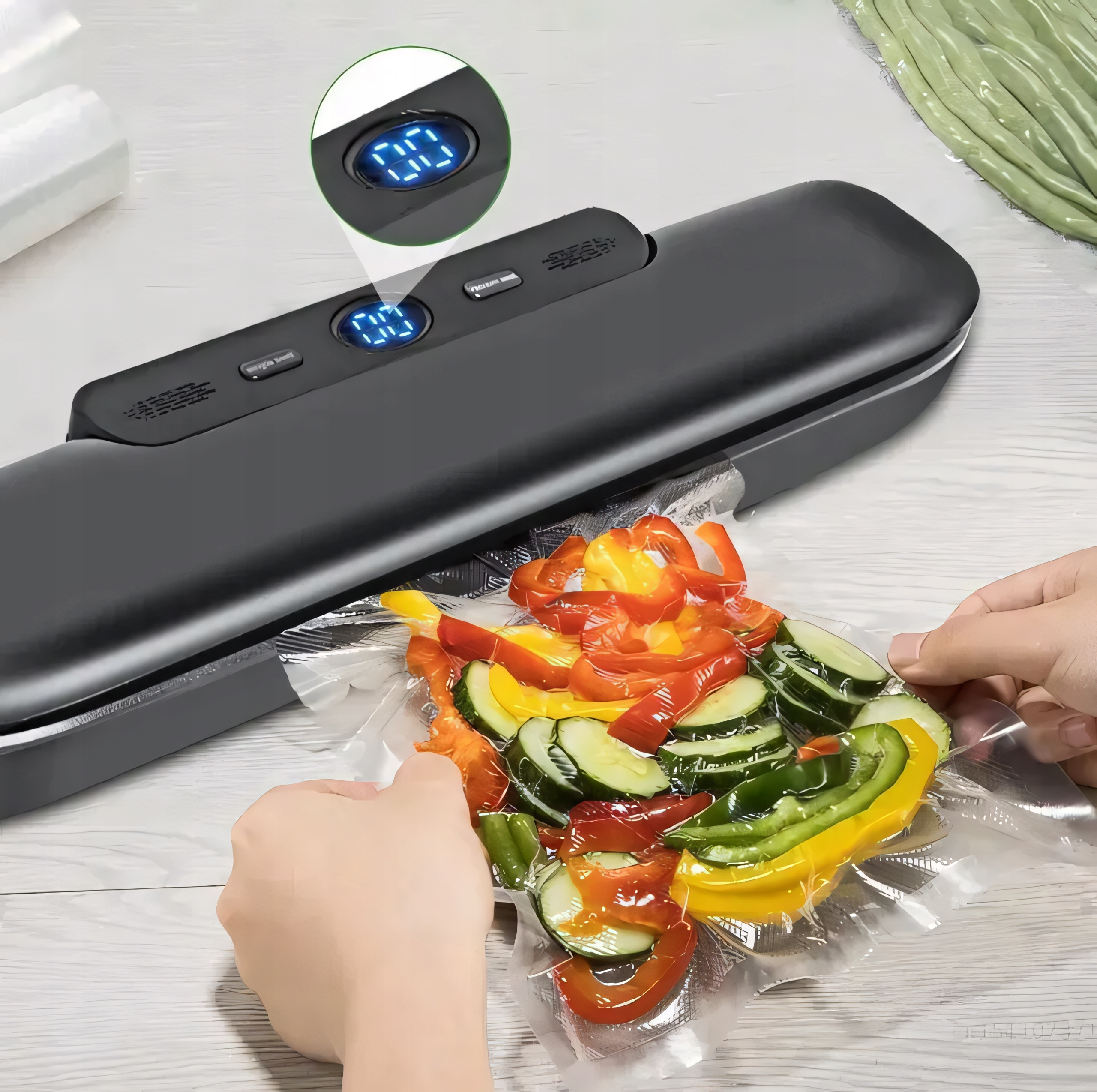 Оснащен функцией «точечной откачки», позволяющей активно выбирать опцию вакуумной запайки в зависимости от типа упаковывать продукты и выполнять вакуумную запайку вручную.