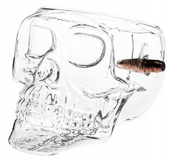 Элегантный пуленепробиваемый стакан в форме черепа. На этот раз шальная пуля застряла в стеклянном черепе, и вылить из него любимый напиток было по-настоящему необычно.