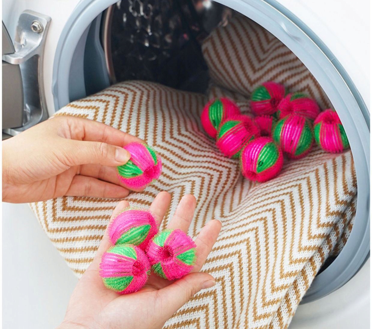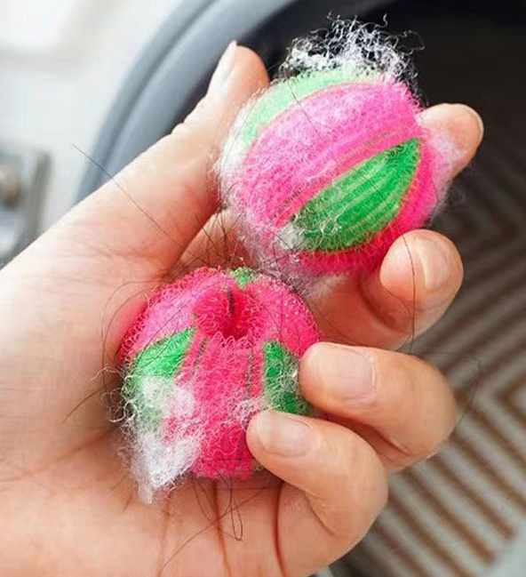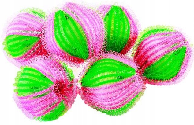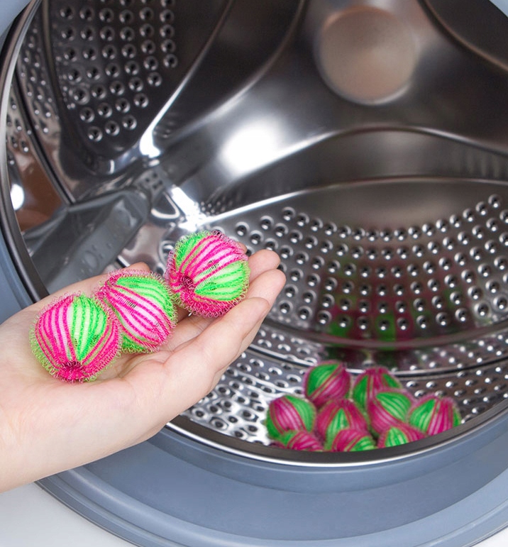 Набор шариков для стирки белья. Структура застежки-липучки задерживает мех, волосы, нитки и другие загрязнения во время стирки, благодаря чему одежда становится чище, а стиральная машина реже требует чистки фильтров.
