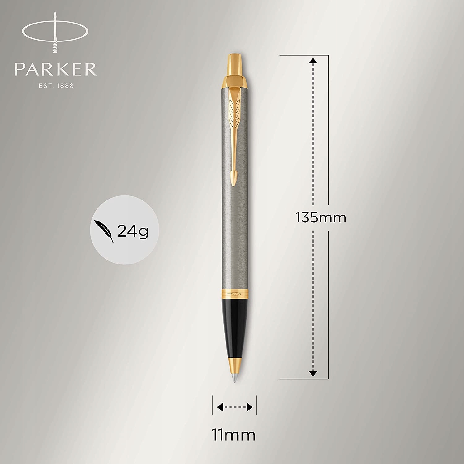 Сочетание тонкого современного силуэта и стильной, изысканной, высококачественной отделки. Матовый металл с поперечной насечкой и золотой отделкой, а также узнаваемый зажим PARKER в форме стрелки.