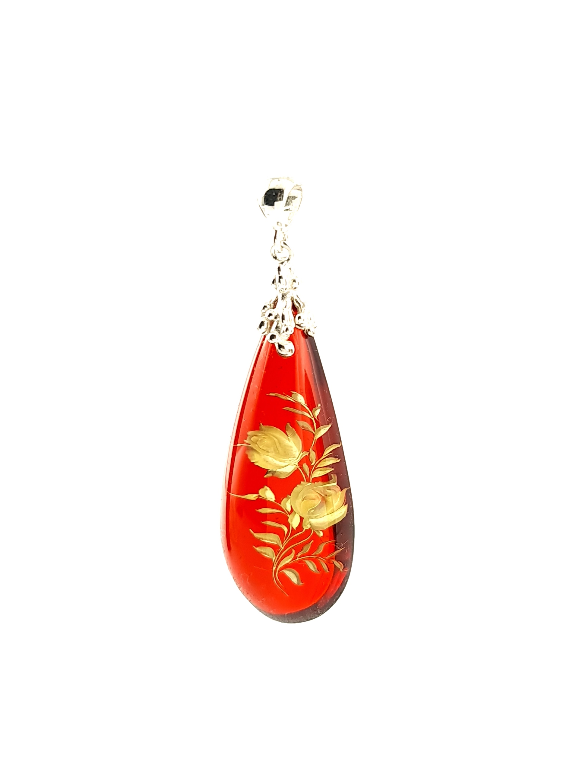 Красивый кулон-капля с розой ручной работы из янтаря в серебре высочайшего качества.