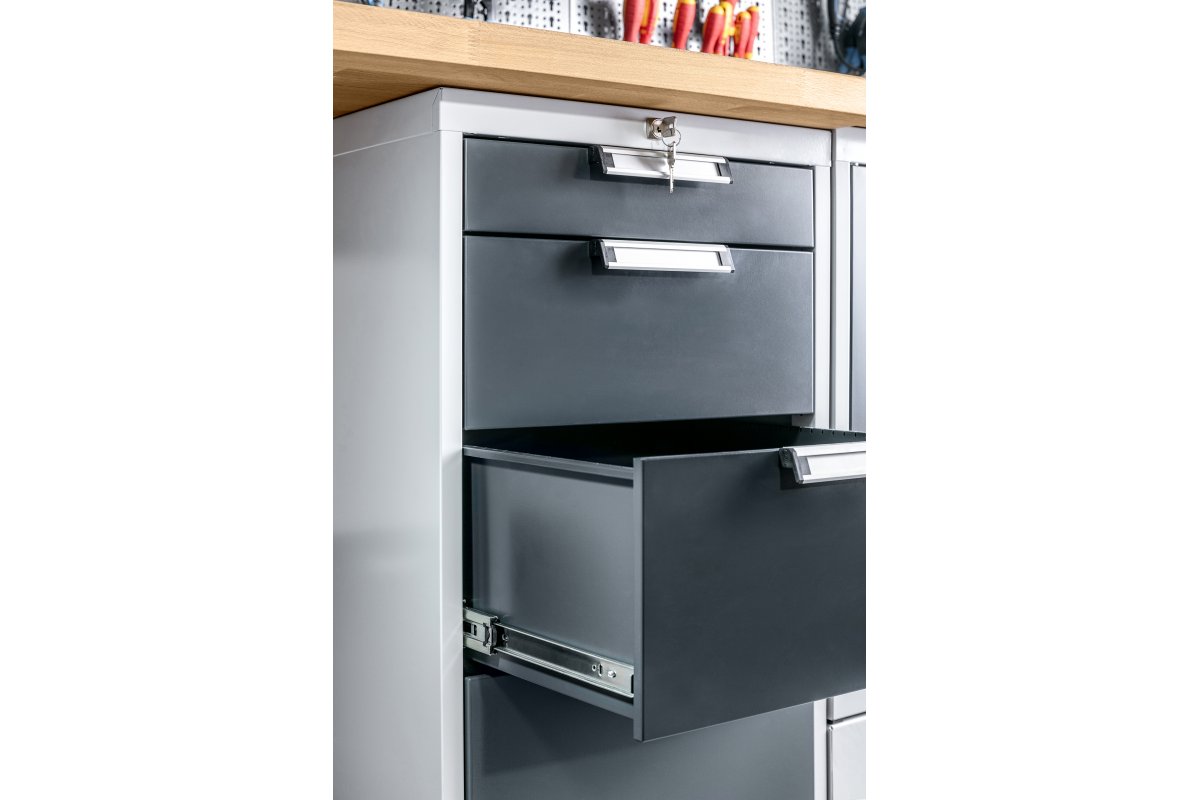 Направляющая изготовлена из толстого листового серебра. Благодаря использованию такого материала направляющая имеет грузоподъемность до 25 кг, что гарантирует длительную эксплуатацию, а также позволяет складывать в ящик более тяжелые вещи.