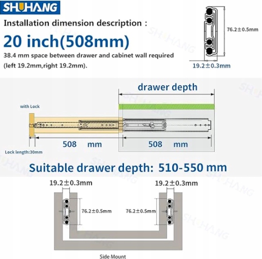 Длина направляющей выдвижного ящика равна закрытой длине. Изготовлен из холодной стали Q235, прочность на растяжение> 400 МПа. Толщина: 2,5 мм, в 4,2 раза выше, чем для обычных ползунков; С молнией, длина: 450 мм, нагрузка: 220 кг, в 8,1 раза больше, чем обычная молния. Раздвижное плавание начинается с 450 мм, и каждый дополнительный 2 -дюймовый уменьшает нагрузку на 4,5 кг.