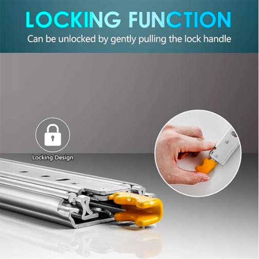 Благодаря блоку защелки, рельс может быть заблокирован или разблокирован путем поворота ручки, и его также можно заблокировать как в закрытом, так и в полностью открытом состоянии, чтобы предотвратить движение и обеспечить безопасность нагрузки. Он может удовлетворить различные потребности, такие как большие и тяжелые ящики, полки, промышленные ящики, наборы инструментов, автомобильные горы, грузовики и т. Д.
