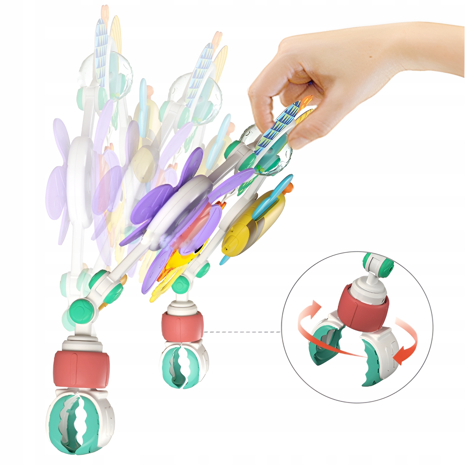 Арк -лук - это универсальная игрушка, которая добавит очарование и развлечения в каждую коляску, автокресло или кроватку. Он чрезвычайно гибкий, благодаря тому, что его можно легко прикрепить практически в любом месте. На повязке на голове есть различные игрушки: вентилятор с божьей коровкой, которая вращается и вибрирует после того, как выкладывает в движение, солнце, которое скрипит во время сжимания, бабочка с прозрачным мячом, в котором красочные шарики и шелест материал, прыжок улитки и кулон для нормы, который может служить тонким. Каждый из этих игрушек имеет различную текстуру, которая стимулирует чувство прикосновения ребенка и помогает в развитии его моторных навыков.