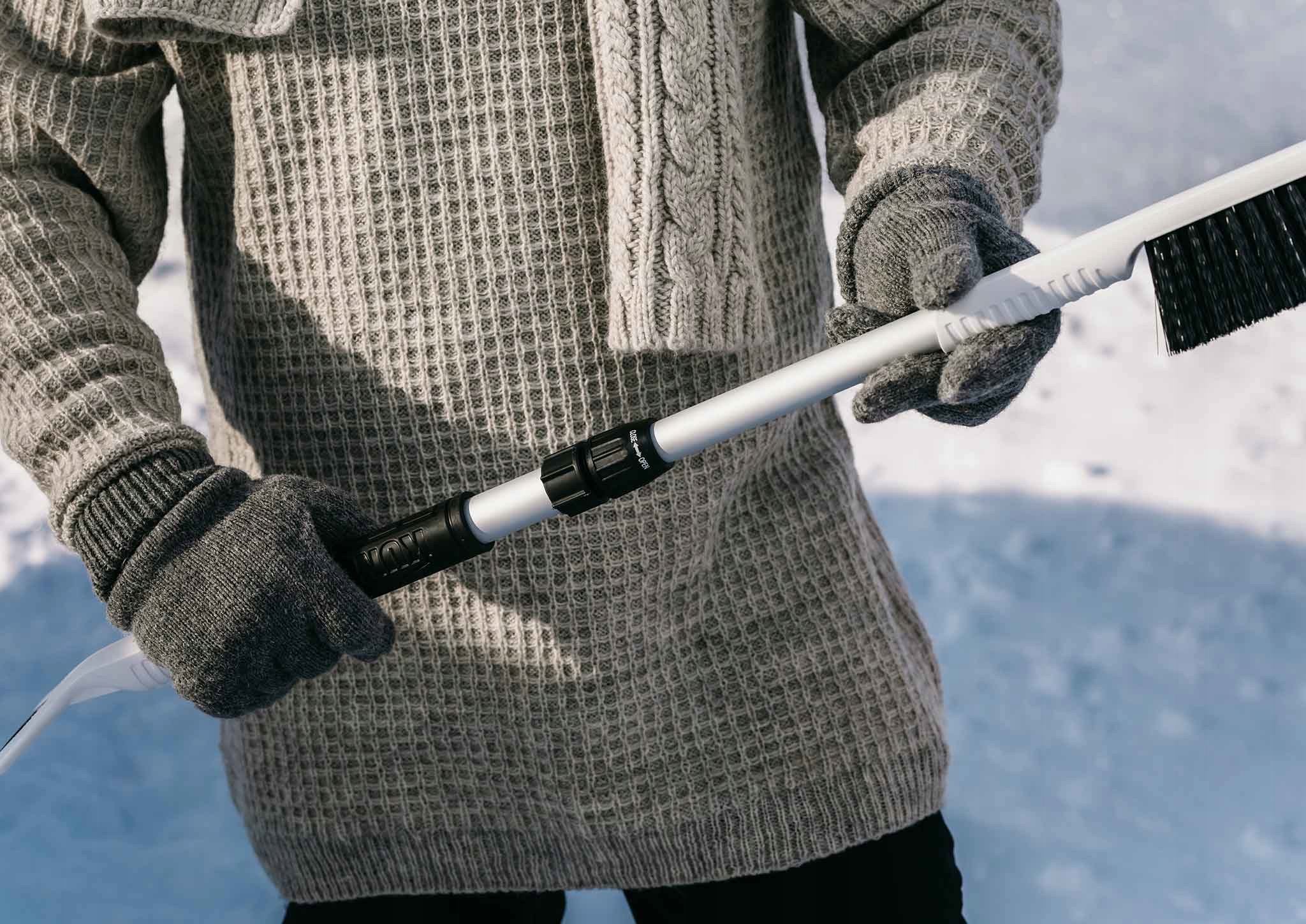 - Плотная щетина щетки удаляет мокрый и сухой снег.