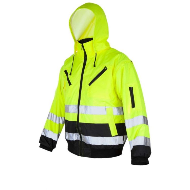 Утепленная защитная куртка из водонепроницаемого флуоресцентного полиэфирного материала Oxford 300D с высокой видимостью, пропитанная ПУ, изнутри отделанная полиэстеровой подкладкой, стеганной на полиэфирном утеплителе.