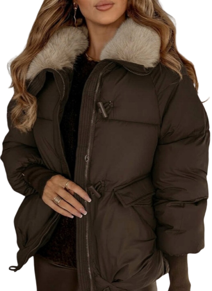КУРТКА ЖЕНСКАЯ СТЕГАНАЯ ЗИМНЯЯ, МОДНАЯ, УТЕПЛЕННАЯ МЕХОМ, ШОКОЛАДНО-КОРИЧНЕВЫЙ, XL