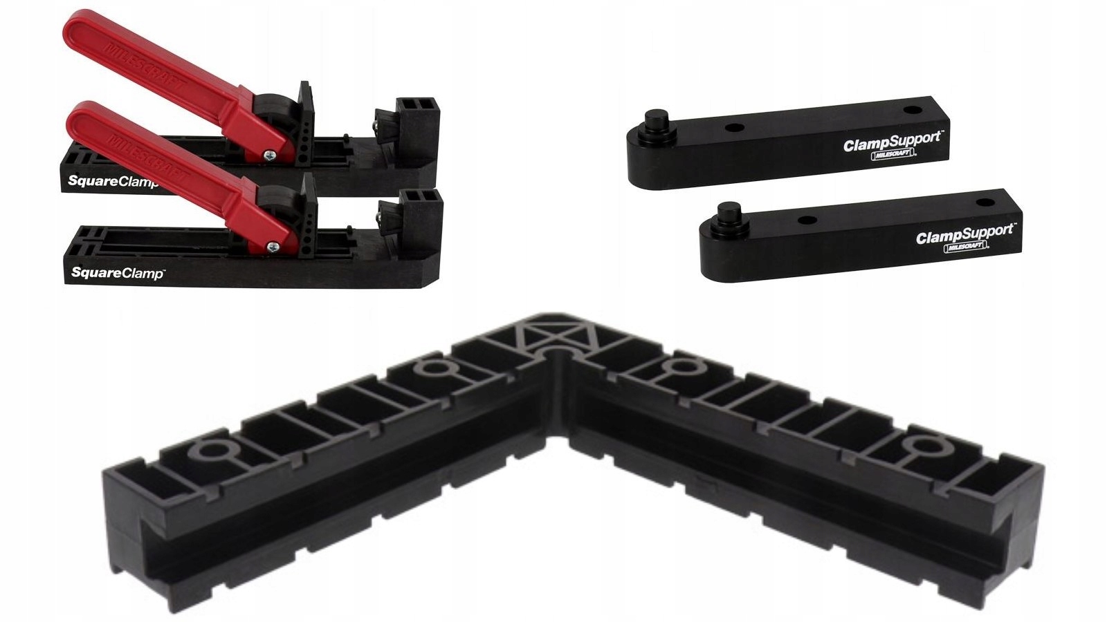 squareclampkit из набора зажима Milescraft , состоящий из 1 раза 200x200 мм, 2 -х зажимов, 2x стабилизирующих прокладки.