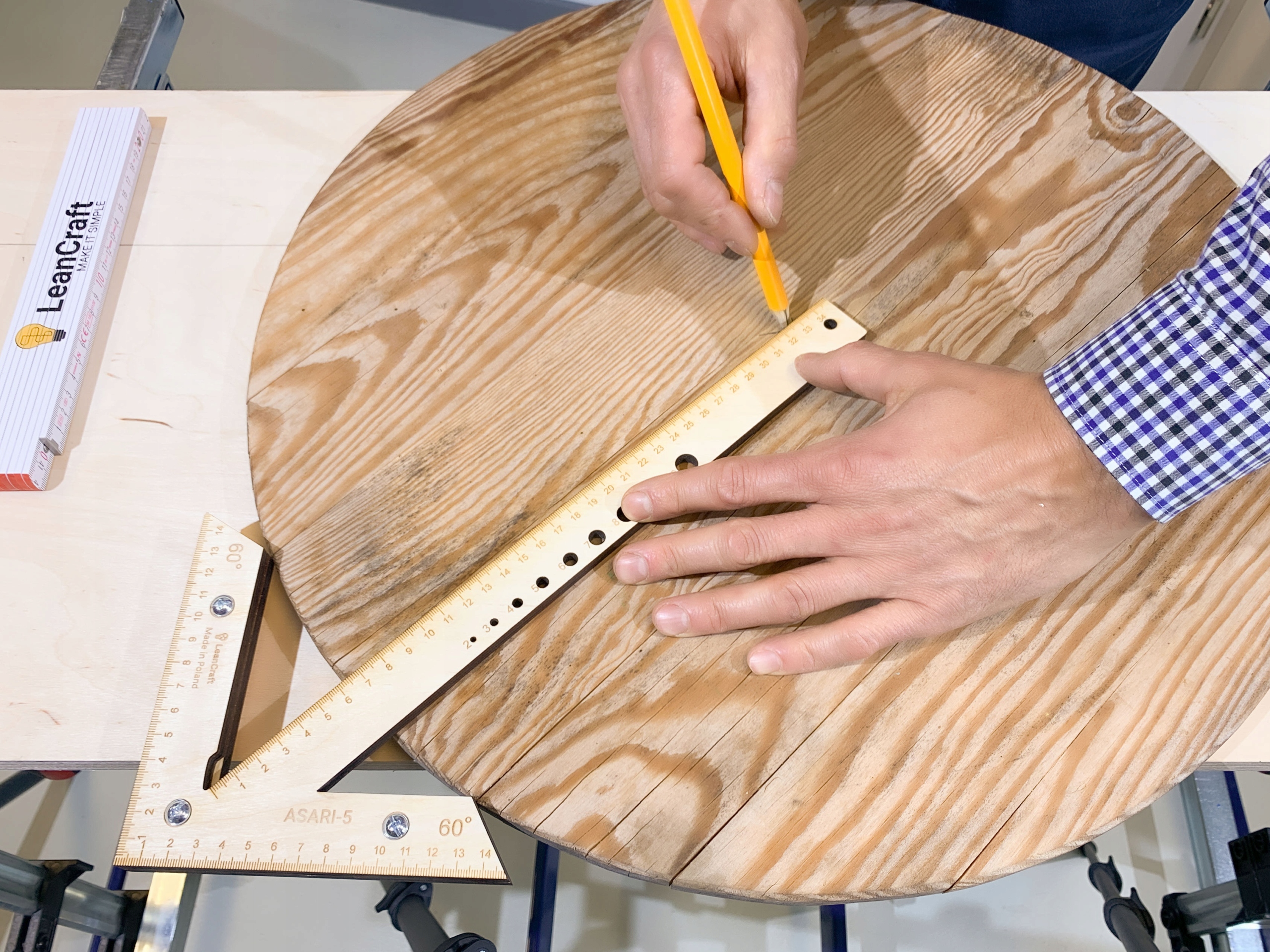 Прецизионный угольник АСАРИ ( центр) для центрирования -5 позволяет точно определить центр круга диаметром примерно до 550 мм. Вытянув рычаг инструмента, например, применив уровень, можно определить центр больших кругов и окружностей, а также отметить длинные линии из угла прямоугольника.
