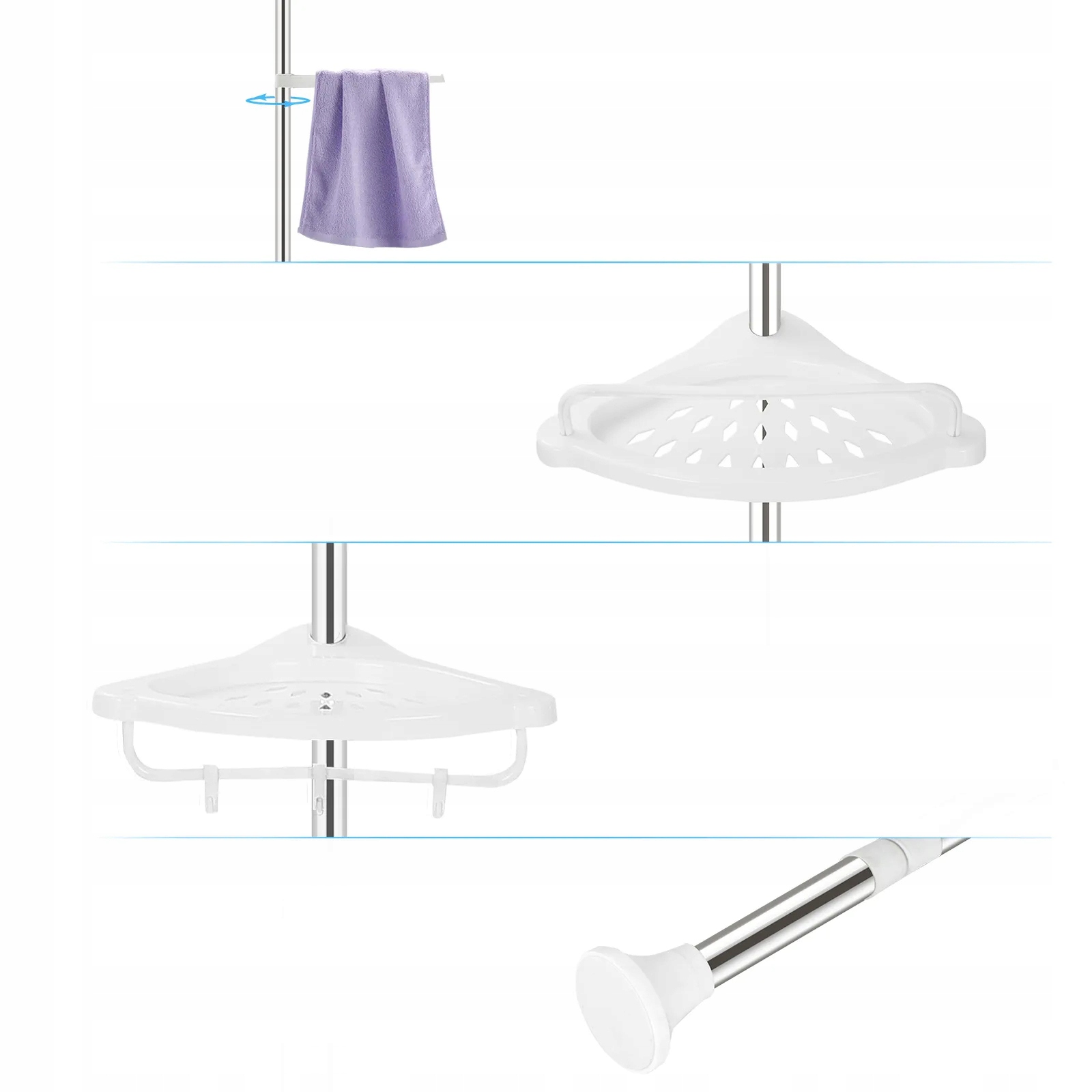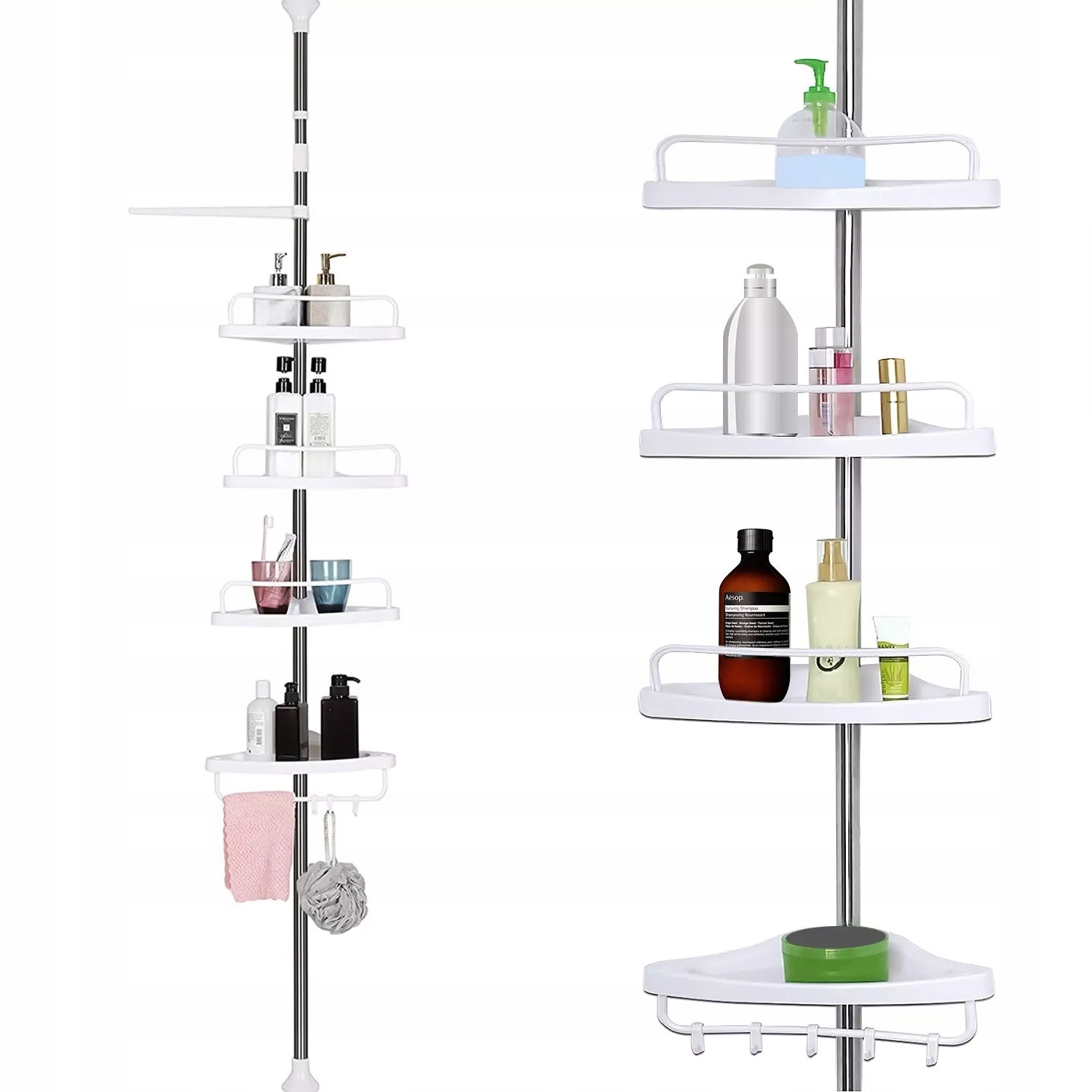 Телескопическую угловую душевую полку можно быстро собрать или разобрать без посторонней помощи. профессиональных или дополнительных инструментов. В верхней части металлического стержня имеется внутренняя пружина, которую можно сжимать или растягивать на 3-5 см. С помощью деталей полку можно установить устойчиво и безопасно, не повреждая стены.