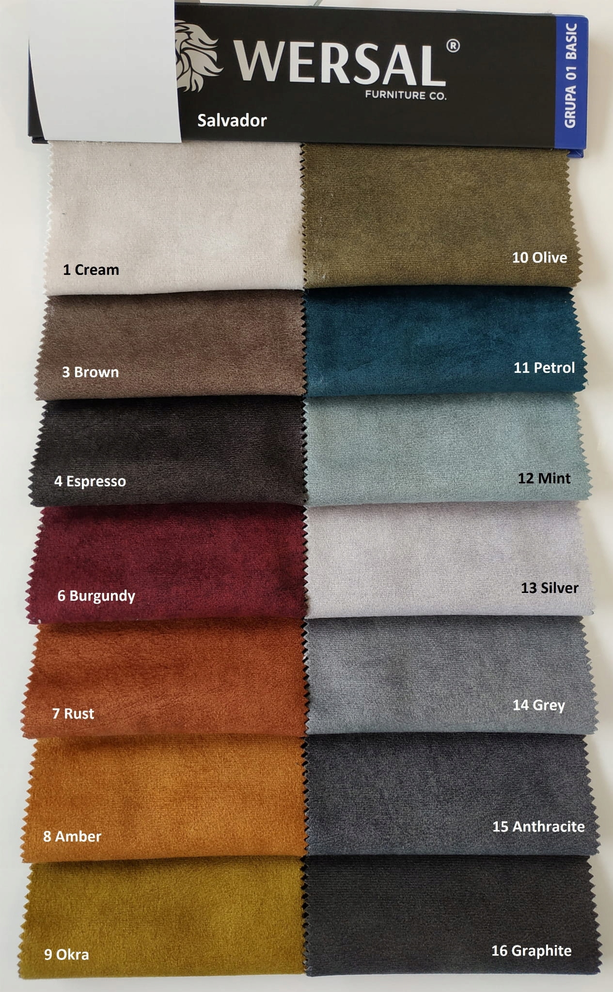 Ткань «Сальвадор» — обивочный материал с приятной, бархатистой поверхностью. Несмотря на мягкость на ощупь, он очень прочен и устойчив к истиранию даже после интенсивного использования мебели или аксессуаров, для которых он использовался. Его дополнительным и большим преимуществом является покрытие, препятствующее впитыванию жидкостей, что значительно облегчает очистку даже, казалось бы, проблемных пятен.