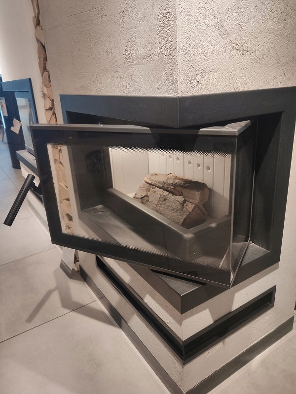 Угловая каминная топка с дверцами BS (склеенные стекла). Благодаря такому решению вы сможете любоваться огнем с обеих сторон в двух комнатах одновременно. Идеальное решение для смежных помещений.